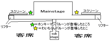注目の1曲目は夏といえばこれでしょう!のさんさんさん'95でした。トータスさんはハイネックの黒の半袖+赤のパンツ、ケーヤンは赤のボーリングシャツ、サンコンはチェックのシャツ+ハーフパンツでした。トータスさんが普通っぽい格好でライブやってるのって慣れなくてなんだか変な感じでした。(笑) ホンキーマンのときにはステージ両サイド(※ステージ見取図)にゴーストバスターズのマシュマロマンみたいなでっかいホンキーマンバルーン&わいもくんバルーンが出現してビックリしました。ホンキーマンバルーンはちょっとムチムチし過ぎだったけど、わいもくんバルーンはいい感じでした。エキスポランドを歩き回っていた等身大3キャラもスクリーン前の通路(?)に出てきて曲に合わせて踊っていました。しょっぱなから3曲終わってのトータスさんは「ええわ〜〜〜。ココ(ステージ)からの景色、みんなにみせてあげたいわ。スゴイで!マジで!」ととても嬉しそうでした。そのあとも何度も「嬉しさがとまらんわ」とか「この会場ではFM802のイベントに2回出させてもらったことがあるけど、その時はいろんな人が出てたから演ってる時間もそれほど長くなくて。でも、今日は俺たちだけのモンや!」と言っていました。